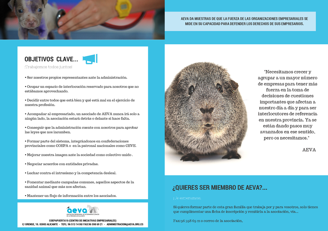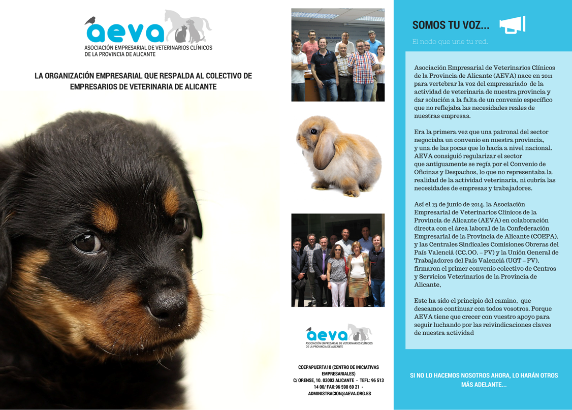 El pasado 1 de octubre, D. Isidoro Mollá, presidente de AEVA presidió la ASAMBLEA GENERAL de la Asociación Empresarial de Veterinarios Clínicos de la Provincia de Alicante, que se celebró en el CEEI de Elche. Asistió a la misma, el Secretario General de COEPA, D. Fermín Crespo que se ñaló la necesidad de estar todos unidos por y para trabajar para la mejora del tejido empresarial alicantino. A su intervención siguió el orden del día programado con la aprobación por unanimidad del acta de la sesión anterior. Así como la de las cuentas anuales de 2014 y el presupuesto 2015. Y la comunicación de la denuncia y promoción del actual Convenio Provincial de Centros y Servicios Veterinarios de la Provincia de Alicante. La necesidad de reforzar la programación de Actividades de la asociación y la captación de nuevos asociados, para lo que se presentó un borrador de folleto informativo. Y la ratificación de la Junta Directiva hasta la celebración de la próxima Asamblea Electoral el 9 de noviembre de 2015.